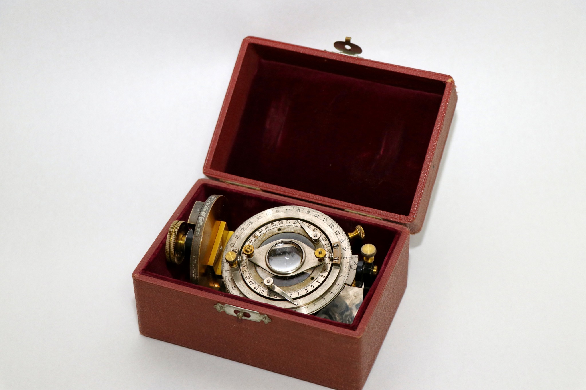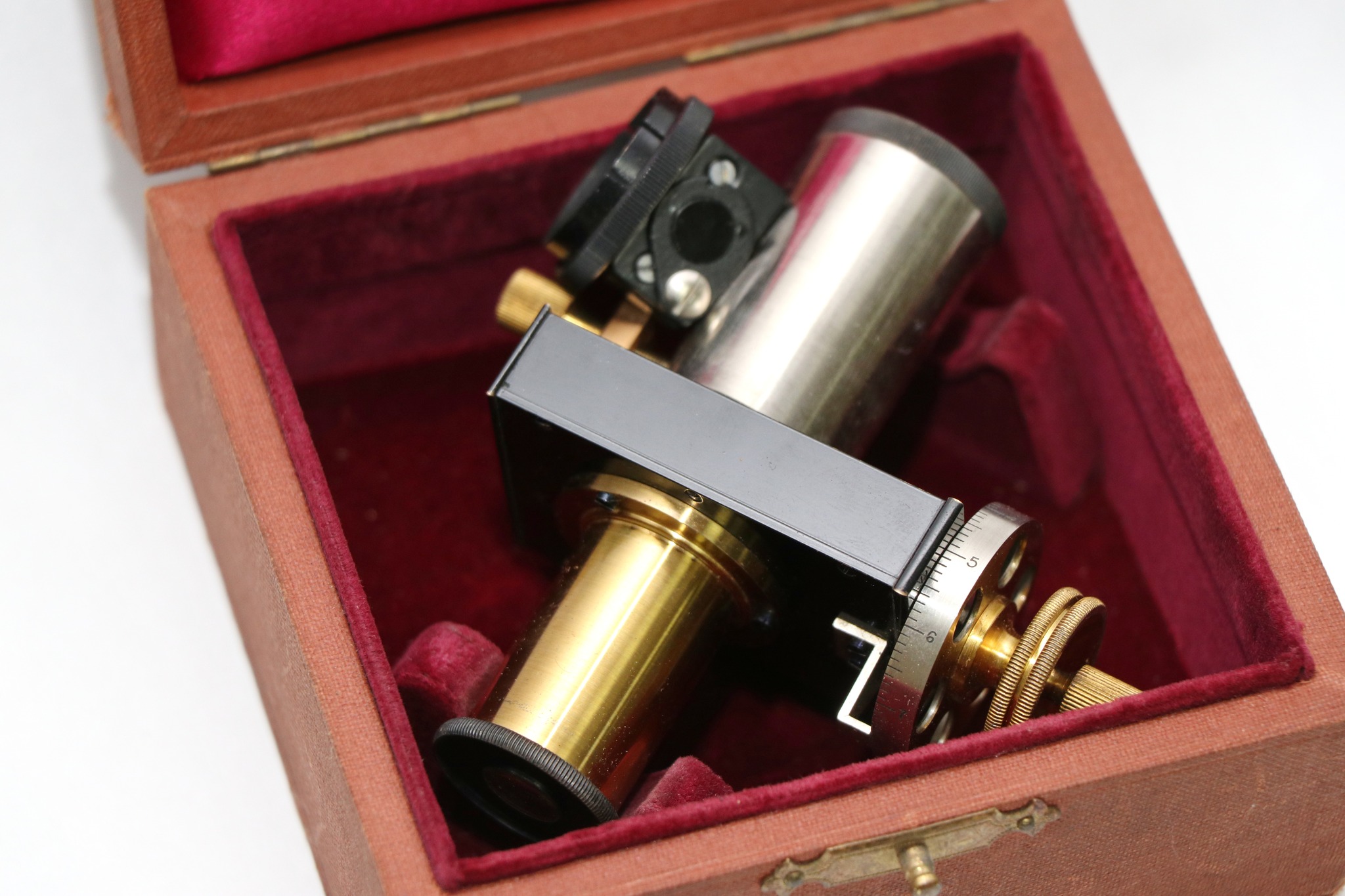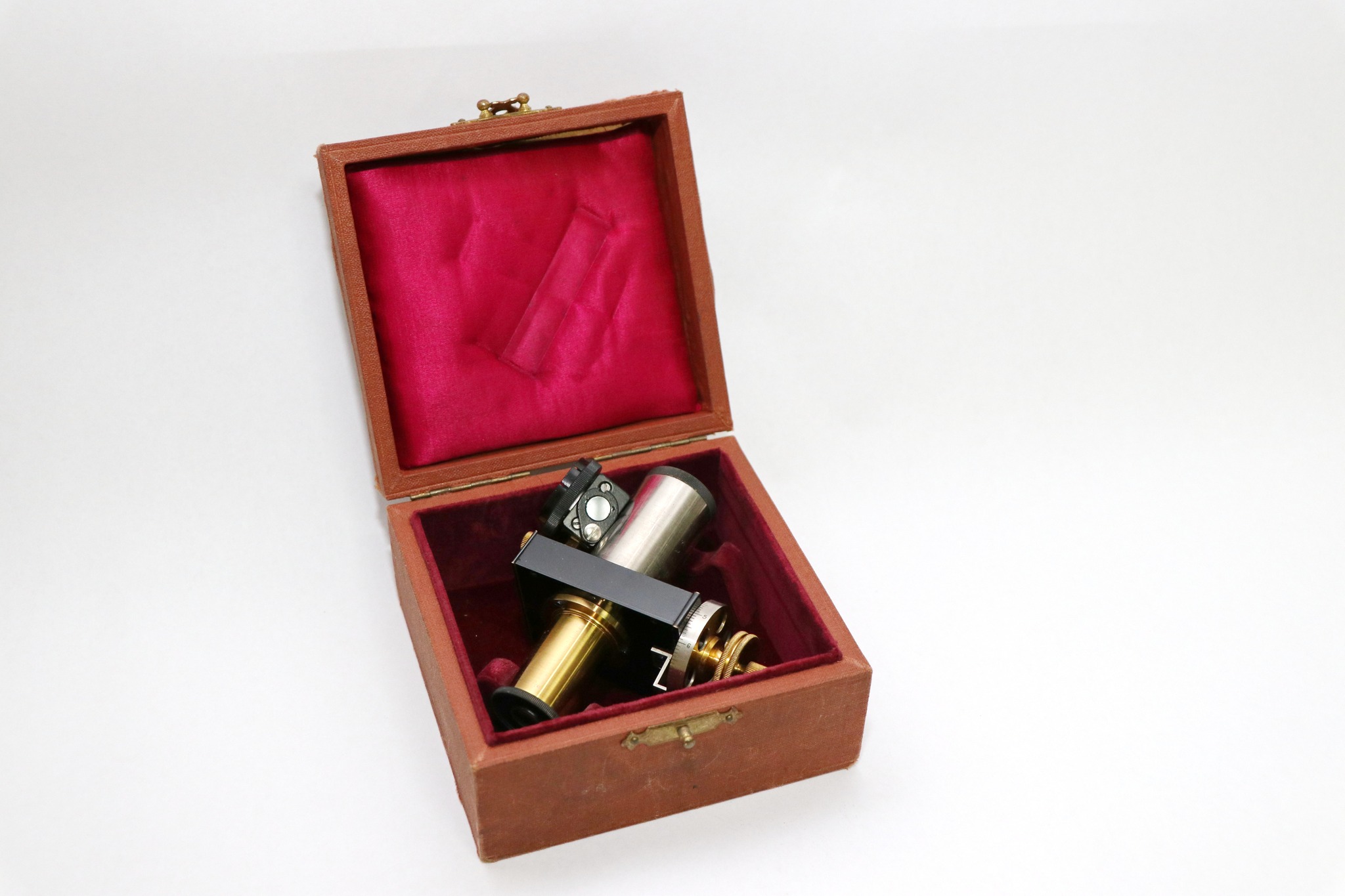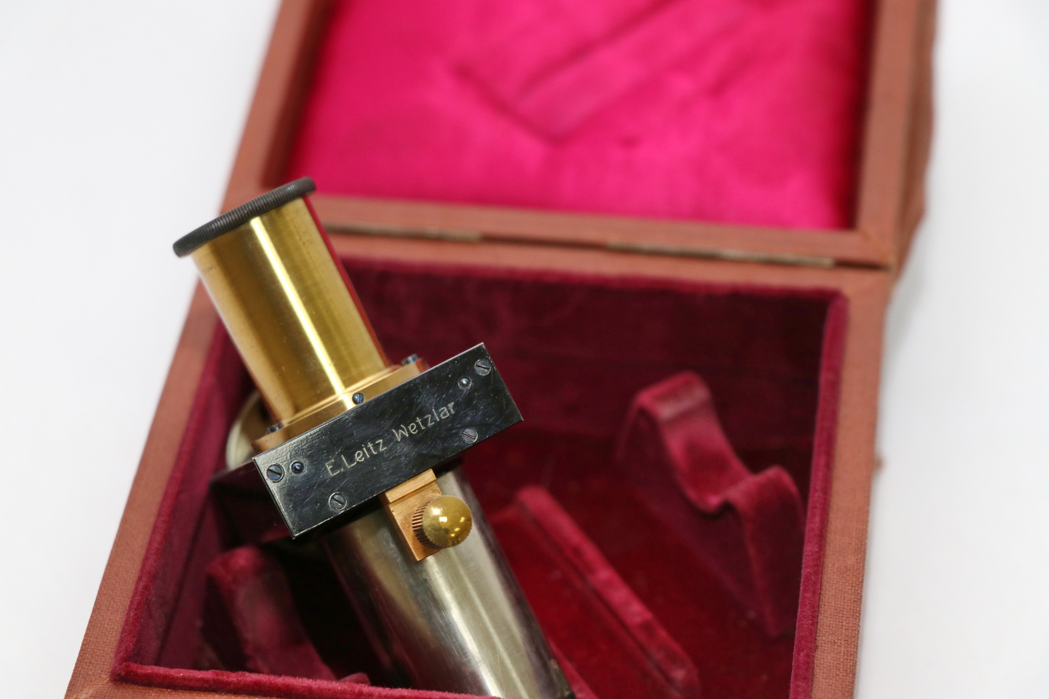 Перше, що звертає на себе увагу – футляр із золотим написом «E. Leitz, Wetzlar». У футлярі знаходиться оригінальний окуляр до мікроскопа. Компанія E. Leitz, Wetzlar – це історичне німецьке оптичне підприємство, засноване в 1849 р. Карлом Келлнером, яке пізніше стало всесвітньо відомим брендом Leica, яке спеціалізується на високоякісних мікроскопах, фотокамерах і іншій точної оптиці. У 1869 р. Ернст Лейтц став одноосібним власником, назвав компанію своїм ім'ям, а його син Ернст Лейтц II у 1920-і рр. почав масове виробництво легендарних камер Leica, що зробило бренд всесвітньо відомим. Штаб-квартира досі знаходиться у м. Ветцлар (Німеччина). Сьогодні компанія існує як кілька окремих, але пов'язаних підрозділів: Leica Microsystems, що виробляє мікроскопи, та Leica Camera AG, що випускає камери.