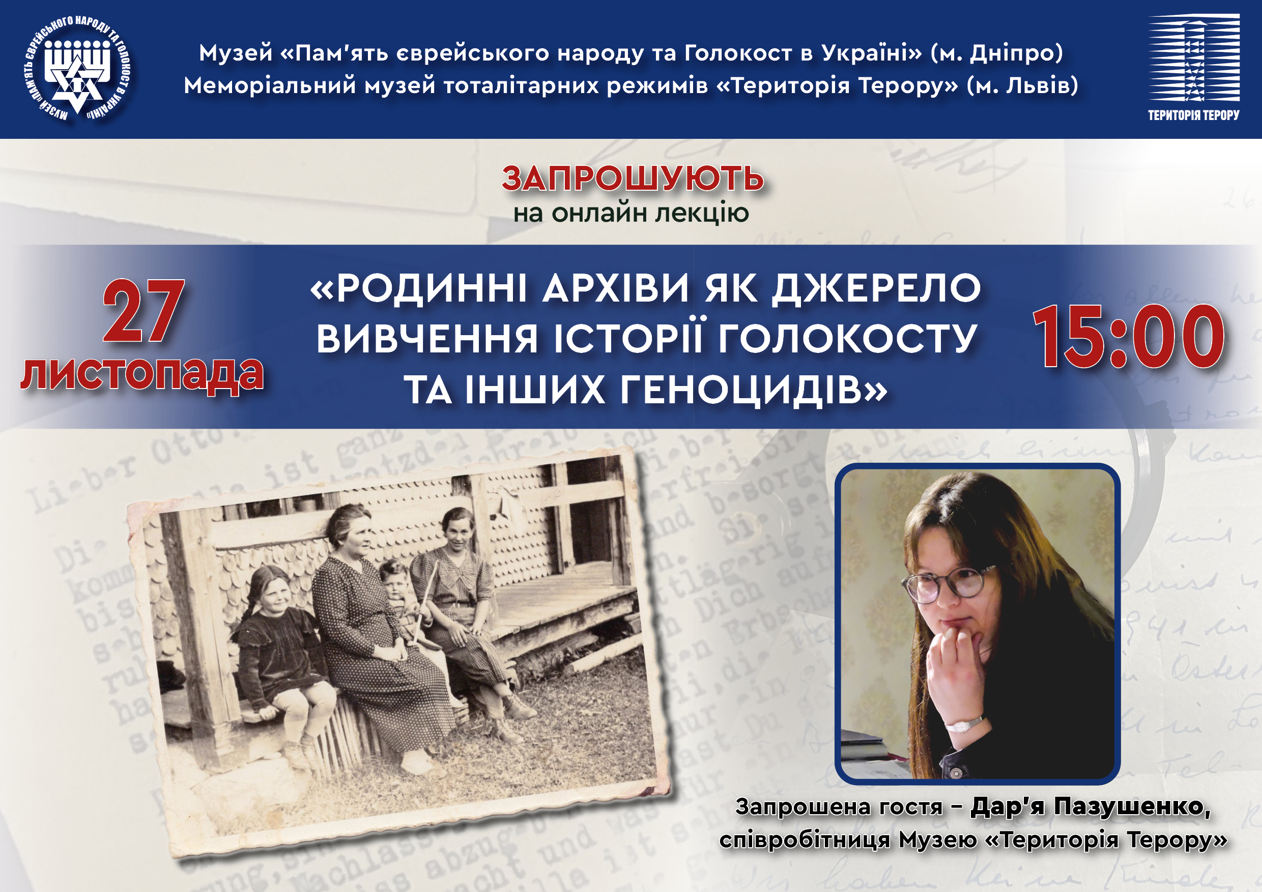 27 листопада (четвер) о 15:00 Музей «Пам’ять єврейського народу та Голокост в Україні» (м. Дніпро) запрошує на лекцію-бесіду Дар’ї Пазушенко, музейниці, наукової співробітниці Меморіального музею тоталітарних режимів «Територія Терору» (м. Львів) під назвою «Родинні архіви як джерело вивчення історії Голокосту та інших геноцидів».